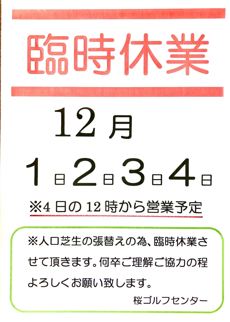 人工芝生の張替えの為、臨時休業させて頂きます。何卒ご理解ご協力の程よろしくお願い致します。