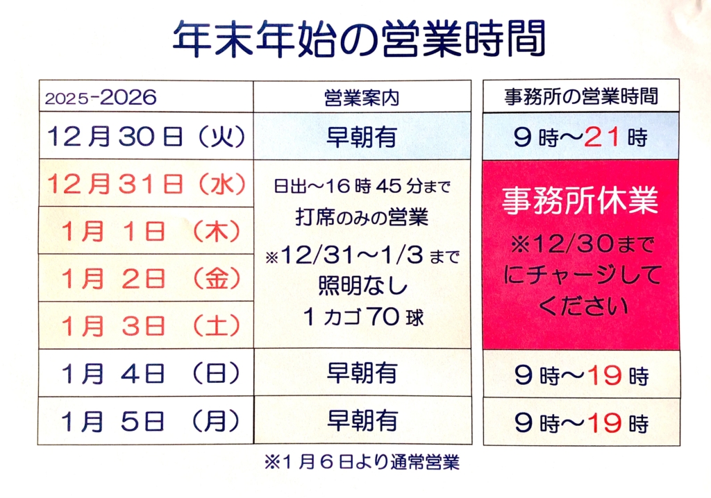 年末年始の予定 2025.12-19 2025年12月31日〜2026年1月3日 (1カゴ70球)当店ICカードをお持ちの方のご利用となります。 事務所お休みのため事前のチャージをお願い致します。 ※はじめての方、期限切れの方、紛失、旧カード、チャージされてない方は、ご利用できません。